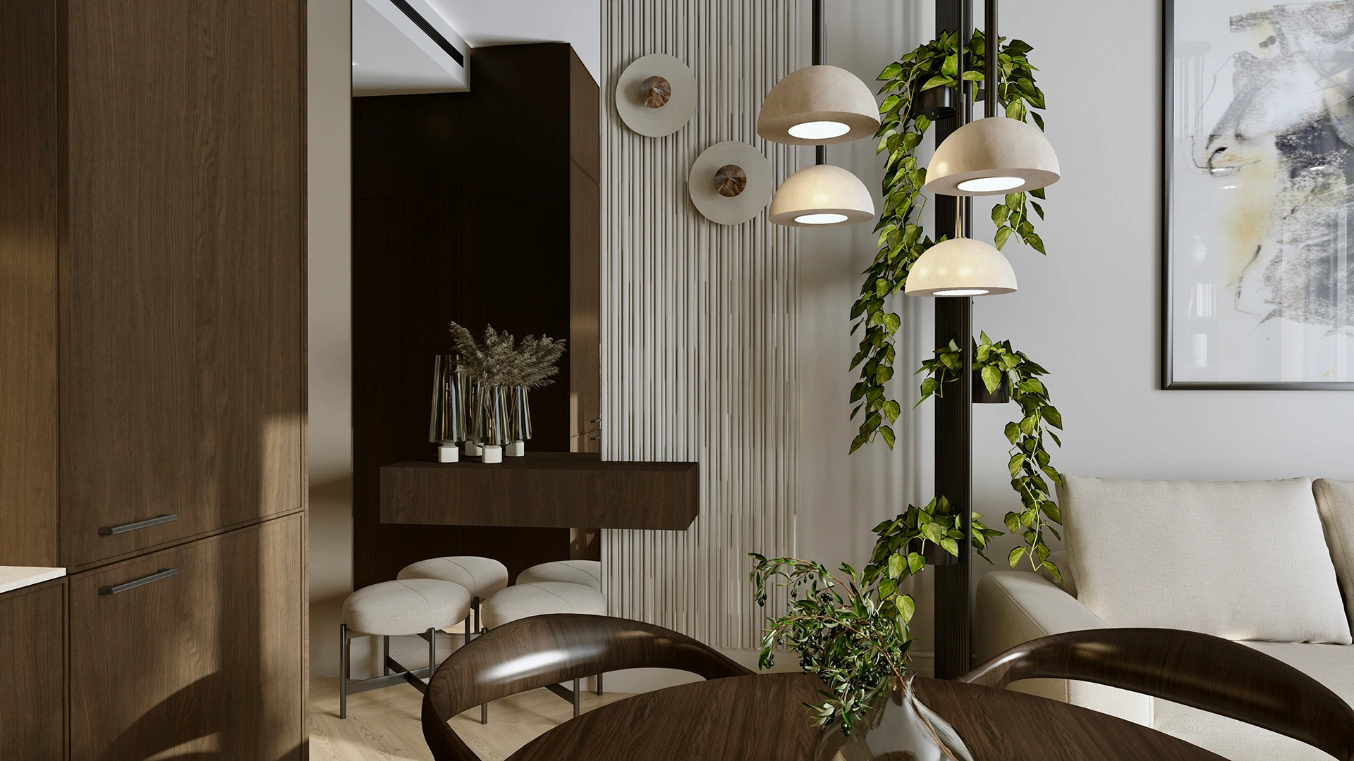 Rozwiązaniem było zastosowanie jasnych barw, naturalnych faktur i mocnych akcentów kamienia, które optycznie powiększają przestrzeń i dodają jej charakteru. Dominujące ciemne drewno zostało zestawione z jasnymi elementami i detalami w kolorze czarnego chromu, co nadało całości elegancki i wyrafinowany ton.