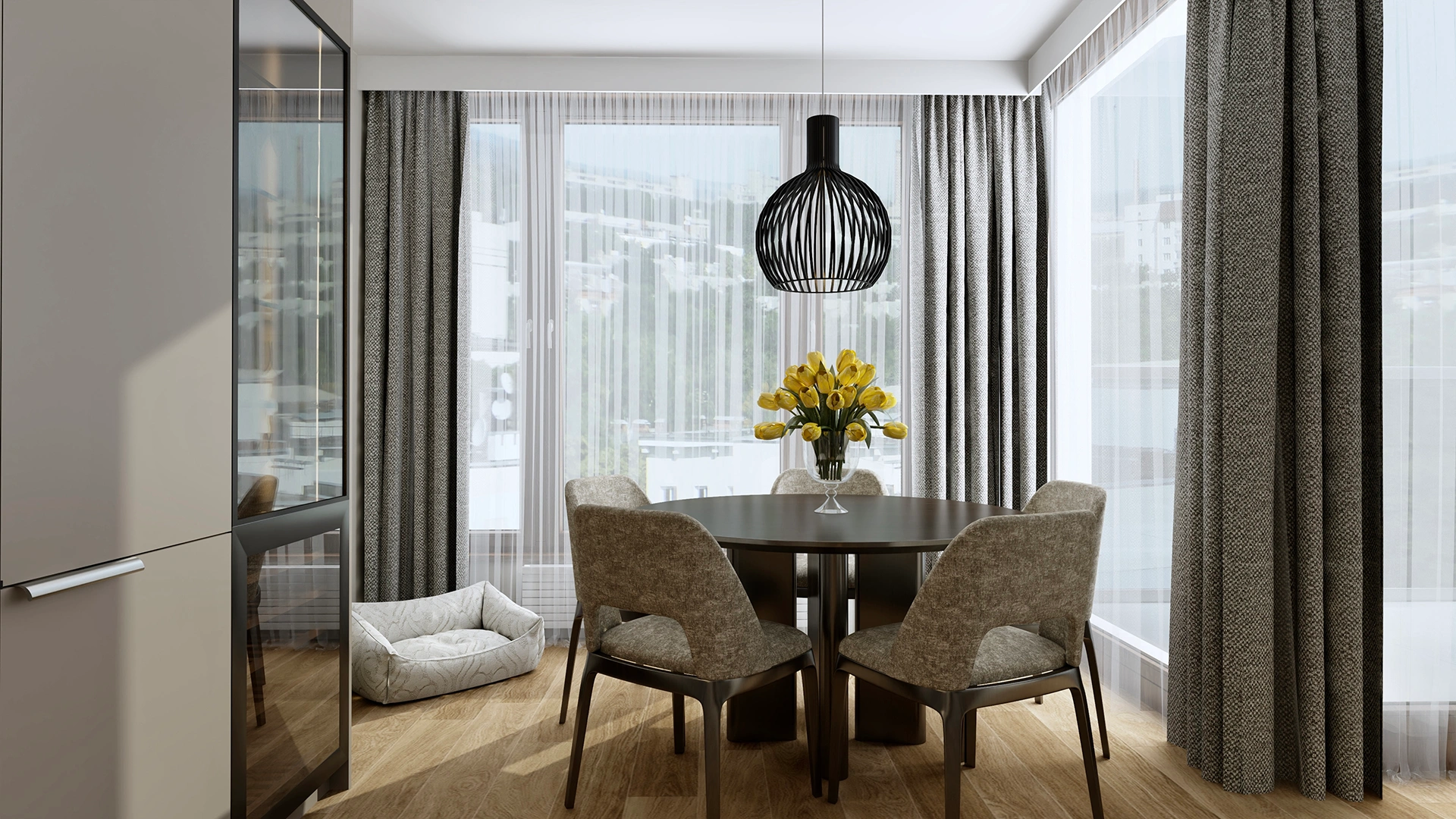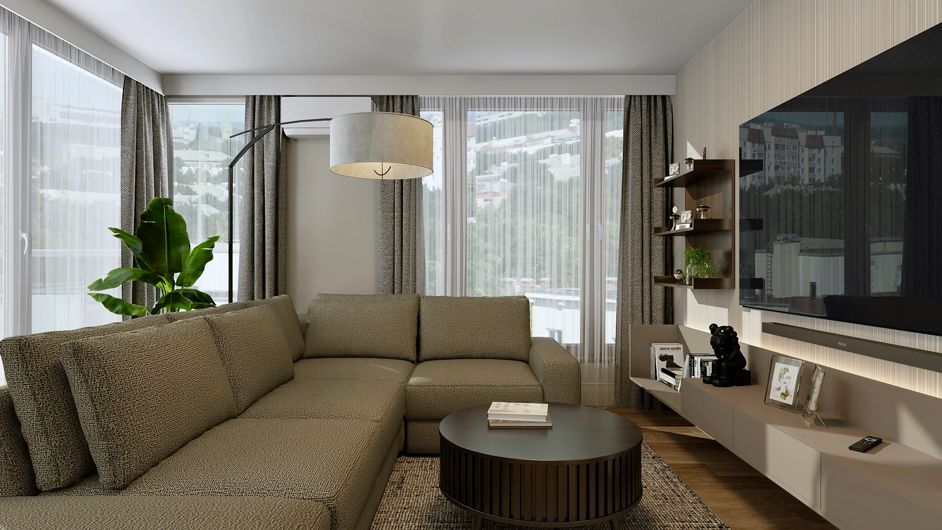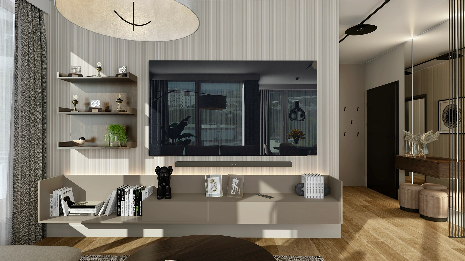 Salon połączony z kuchnią to serce apartamentu – przestrzeń, w której elegancja spotyka się z komfortem. Otwarta kuchnia w odcieniach taupe i czerni z blatem z naturalnego kamienia tworzy kontrastowy, ale spójny duet z miękką sofą i drewnianą podłogą. Subtelne akcenty z czarnego chromu i gra świateł podkreślają nowoczesny charakter wnętrza.