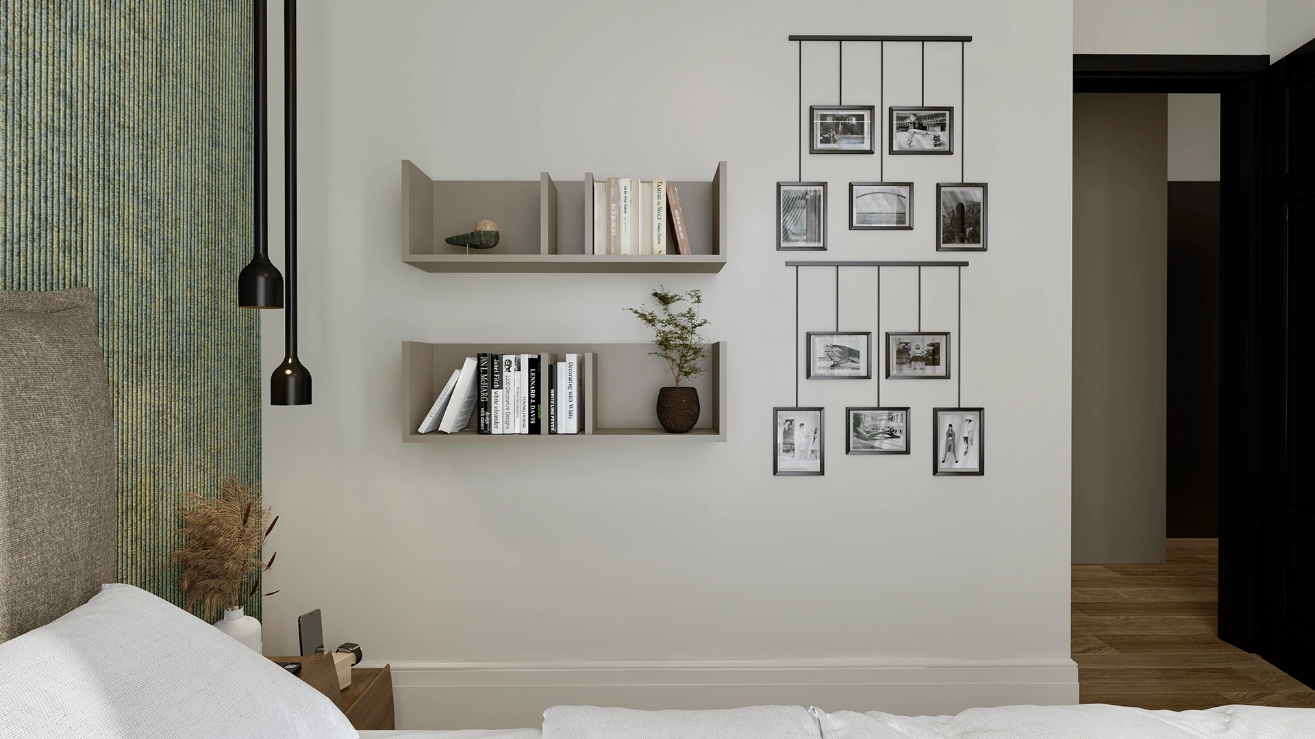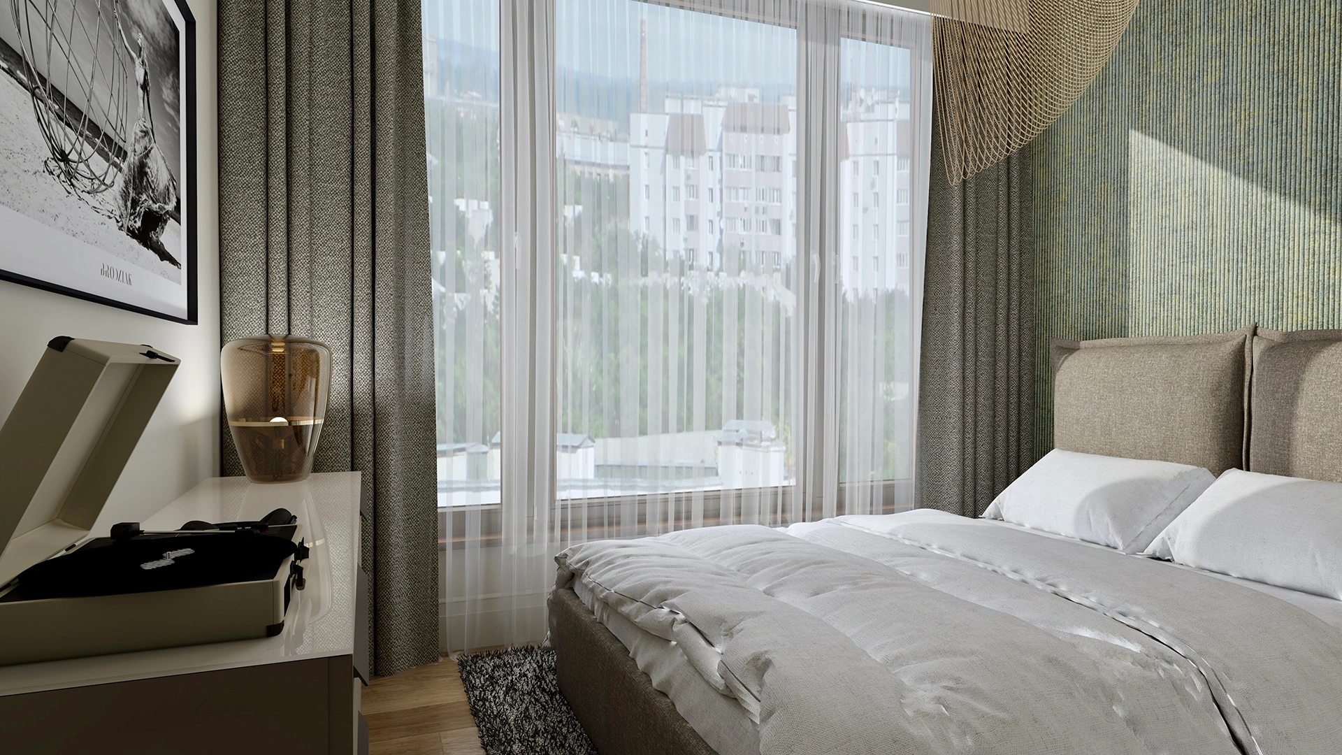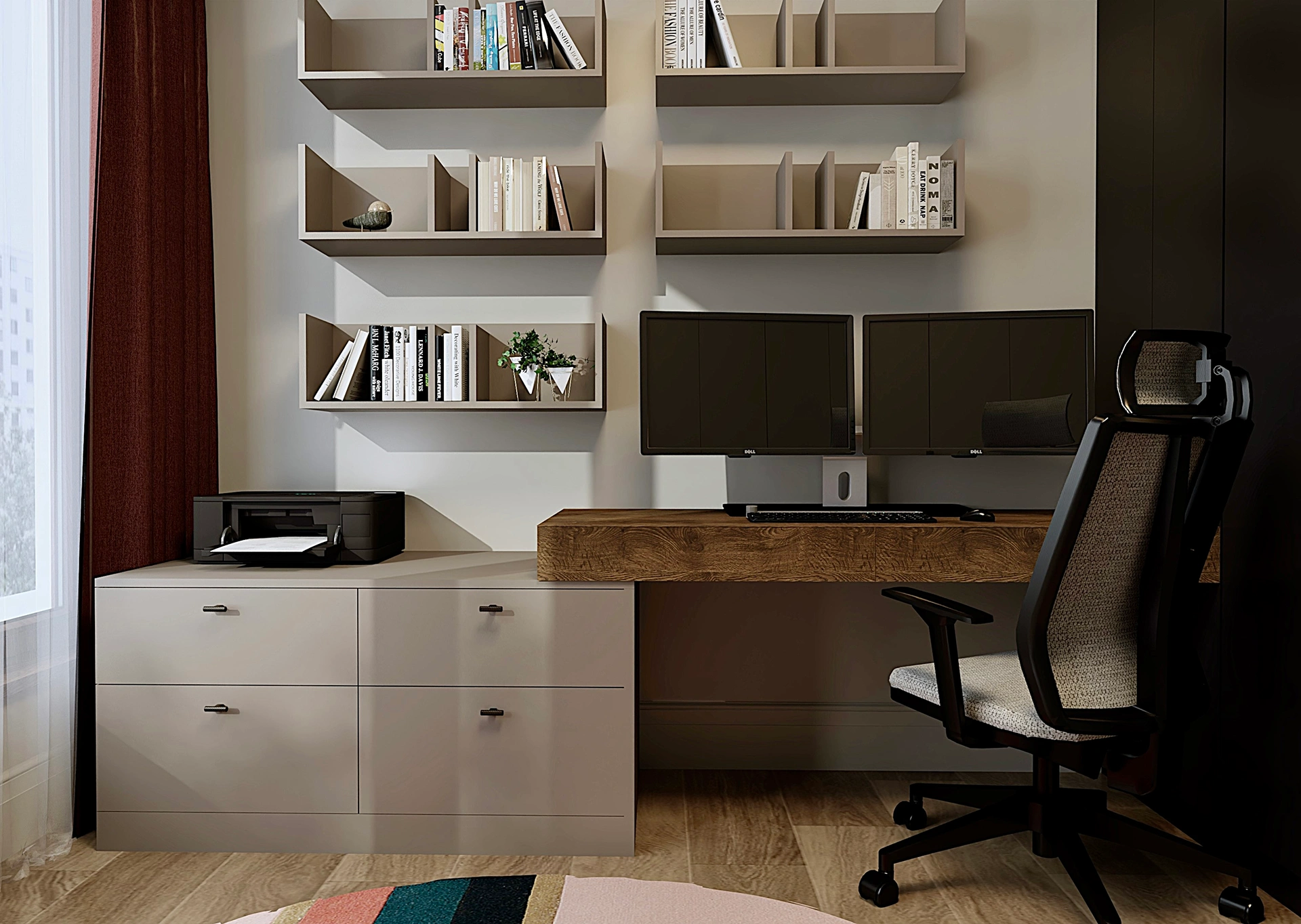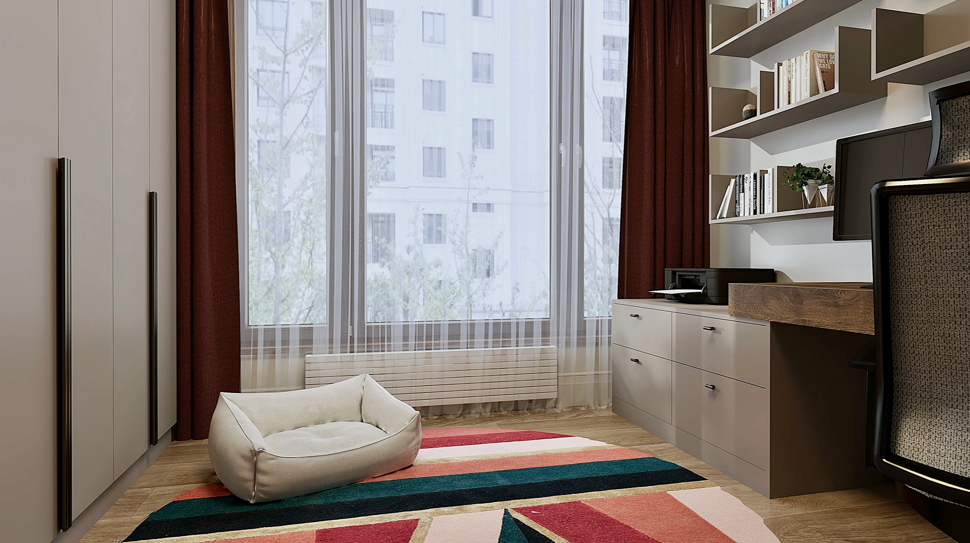 W sypialni wprowadzono elementy natury – tapeta inspirowana strukturą lnu, delikatne tkaniny i miękkie oświetlenie sprawiają, że przestrzeń staje się spokojnym azylem po dniu pełnym wrażeń. Gabinet z dużą ilością miejsca do przechowywania i wyrazistym dywanem kolorystycznie ożywia całość, pozostając w tonie nowoczesnej elegancji.