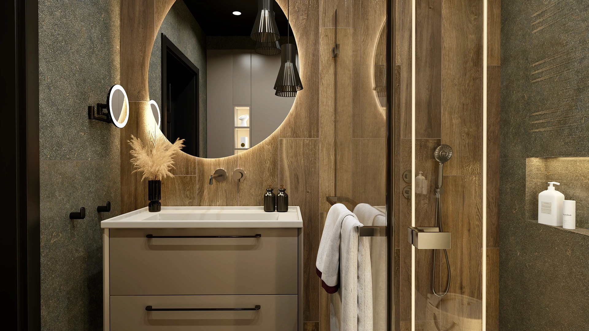 Łazienka utrzymana w ciemniejszych tonacjach to połączenie drewna, czerni i grafitowego kamienia, które daje efekt przytulnego, ale wyrafinowanego SPA.